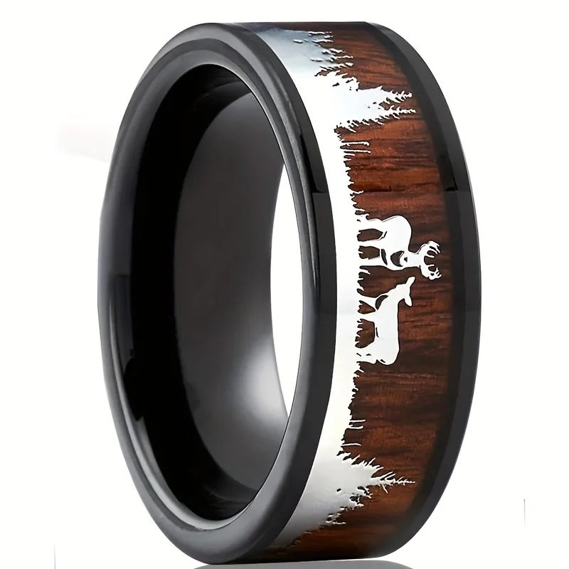 2025 خمر كوا الخشب البطانة الغزلان الأيل الصيد صورة ظلية خواتم 8 مللي متر موضة الفولاذ المقاوم للصدأ الرجال خواتم للرجال/النساء مجوهرات هدية